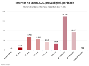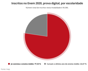 Das 101.100 pessoas inscritas nesta modalidade, 96.086 confirmaram a inscrição. O Enem digital em 2020 será aplicado para 1,66% do total de candidatos.